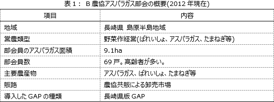 調査対象のB農協アスパラガス部会は長崎県の雲仙普賢岳を囲む島原半島の3市をエリアとしている。当地域は県内の耕地面積の約4分の1を占めるものの傾斜地が多く、耕地は細分化されている。耕地の約6割が畑地であり、そこでは全国でも有数のばれいしょ生産をはじめ、いちご、トマト、だいこん、にんじん等の野菜を中心に、みかん、ビワ等の果樹類も含め、50品目を超える農産物が栽培されている。(九州農政局(2012)、B農協パンフレット)