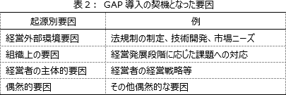 ここで当部会が県版GAPを導入するに至った経過をみてみる。GAP導入の判断には複数の要因が影響していたと考えられ、ここではそれらの要因を次の4つに整理した(表2)。