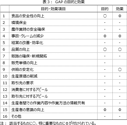 当部会が県版GAPを取得した目的と取得後に認められた効果をまとめたものが表3である。全体的にみると導入目的に対する効果が認められたと評価することができる。このうち顕著な効果が認められたものは次の項目である。
