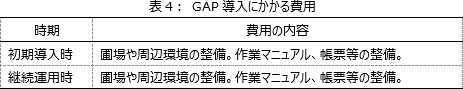 次に、GAP導入にかかる費用について、初期導入時とそれ以後の運用時に分けてみてみる(表4)。かかった費用は導入時、運用時ともに「圃場や周辺環境の整備」「作業マニュアル、帳票等の整備」費用であった。GAPを実践するうえで、これまで個人任せであった廃棄物の処理について、部会としてゴミ袋を配布したり、廃ビニールの処理に取り組んだことが新たな費用となっている。また部会員の全員が取り組める内容にするなどの工夫をこらした点が帳票整備の費用となった。