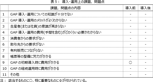 GAPを導入・運用するにあたっての課題・問題点について導入前後に分けて示す(表5)。当部会では導入前後の両方において顕著な課題・問題点は認められない。導入したGAPが比較的容易に取り組むことが可能な県版GAPであったことや、導入時に県職員からの十分な支援があったことが影響しているといえる。