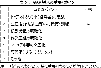 最後に、GAP導入・運用にあたっての重要なポイントを表6にまとめた。特に重要な点として生産者への教育・訓練があげられている。部会員数が多いこと、とりわけ高齢者も多数であることからGAP導入に際して、GAPとは何かからその目的、意義について丁寧に時間をかけて説明する必要があった。またこうした説明をGAPだけのために実施することは困難であり、日々の営農指導や研修の機会に、GAPの話題を提供するなど根気よく取組むことが必要であったといえる。