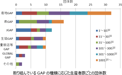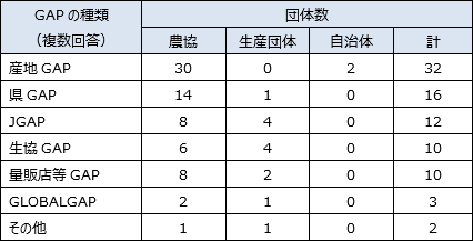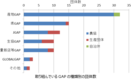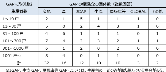 各団体が取り組んでいるGAPの種類は、産地が独自に作成したGAP(以下、産地GAP)が32団体と半数以上であり、次いで県GAPが16団体である。農協が取り組んでいるのは、産地GAP(30)と県GAP(14)が多く、その場合、GAPに取り組む生産者数は100戸以上が多い。特に生産者数が300戸を超える場合は1団体を除き、産地GAPまたは県GAPである。自治体2団体は、いずれも産地GAPである。一方、9の生産団体が取り組んでいるのは、主にJGAP、生協GAP、量販店等GAPである。
