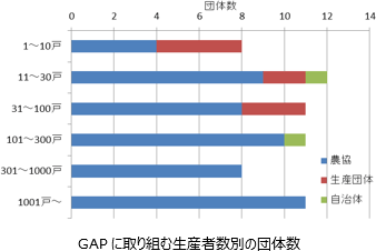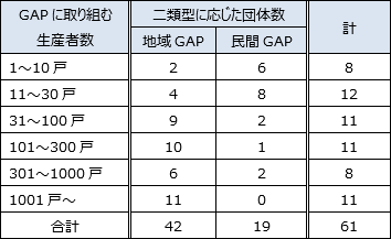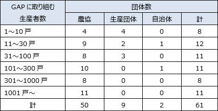 以下では、GAPの運用を中止した2団体(うち農協1:JGAP、生産団体1:量販店等GAP)を除く。