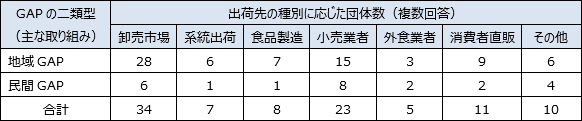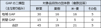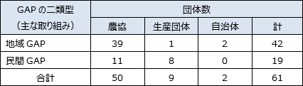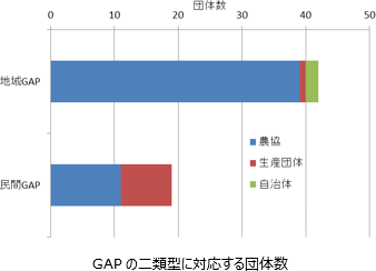 ここで、GAPの種類を二類型化して、産地GAPや県GAPなどの地域全体で取り組んでいるものを「地域GAP」、JGAP、GLOBALGAP、生協GAP、量販店等GAPなどの取引先との取引条件や付加価値目的として取り組んでいるものを「民間GAP」と定義する。さらに各団体について、地域GAPまたは民間GAPのいずれか主力的に取り組んでいる方に分類する。農協は地域GAP主体の方(50団体中39)が多く、生産者団体は民間GAP主体の方(9団体中8)が多い。