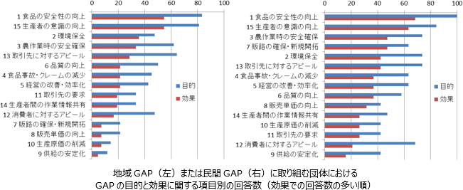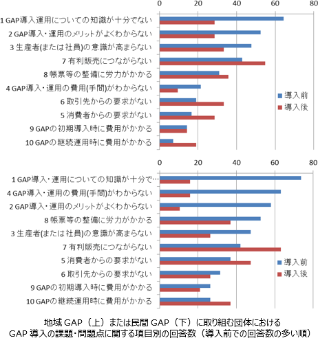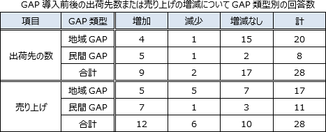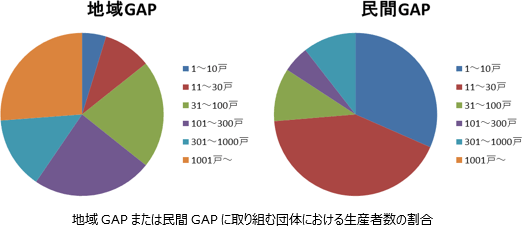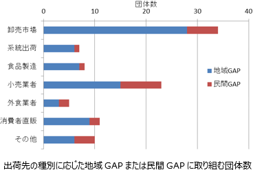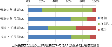 地域GAPは一般にチェックリストの管理項目数が数十ほどで比較的少なく、導入にかかる費用や手間も比較的少ない。GAPの事務局管轄下で比較的多数の生産者が取り組んでいることが多く、内部点検のみである場合が多い。出荷先は卸売市場が特に多く、またGAP導入による出荷先の数や売り上げの増加がないケースが多い。一方、民間GAPはチェックリストの管理項目数が数百に及び、内部点検だけでなく二者点検や第三者点検が行われるなど、比較的費用や手間がかかるため取り組みが容易ではない。出荷先は小売業者などの卸売市場以外の業者である場合が多い。また、販売目的でGAPを導入しているためでもあるがGAP導入後に出荷先の数や売り上げが増加したケースが比較的多い。