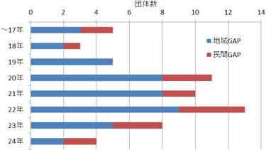 調査対象とした団体においては、平成20年から22年の間にGAPの取組を開始したのが34団体と半数以上である(開始年が無回答の2団体を除く59団体中)。また、平成20年以降に取組を開始したのが地域GAPに取り組む団体では42団体中32(76%)、民間GAPに取り組む団体では17団体中14(82%)である。