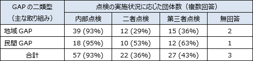 GAPの二類型間で比較すると、地域GAPに取り組む団体では内部点検のみの実施が多いのに対し、民間GAPに取り組む団体では二者点検および第三者点検を実施している割合が際だって高い。このことは、地域GAPと民間GAPの取組における特徴的な違いである。