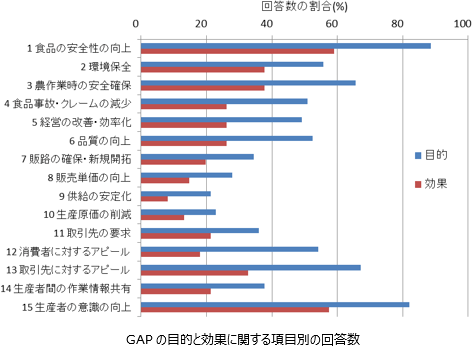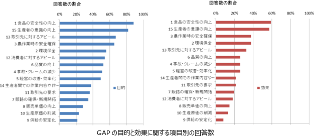 GAPの目的について、回答が多い項目は「食品の安全性の向上」と「生産者の意識の向上」、次いで「取引先に対するアピール」、「農作業時の安全確保」、「環境保全」、「消費者に対するアピール」、「品質の向上」、「事故・クレームの減少」、「経営の改善・効率化」の順である。