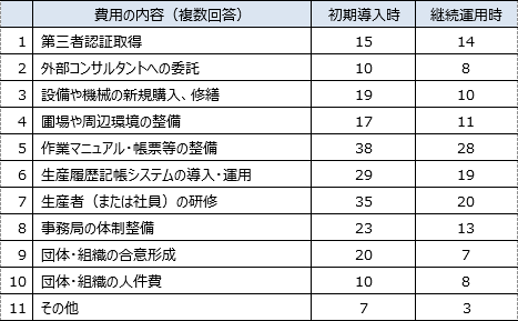 導入後は、上記の3項目が導入前と比べて減少しており、事務局や生産者の理解や意識が高まる傾向にあることがわかる。その一方、「有利販売につながらない」、「消費者からの要求がない」、「取引先からの要求がない」という回答が導入前より多い。このことは、導入後に販売面でのメリットを得ることが難しい傾向にあることがわかる。また、「帳票等の整備に労力がかかる」ことは導入前後ともに回答が多く、マニュアルや帳票類の作成だけでなく更新にも労力がかかる傾向にあるといえる。