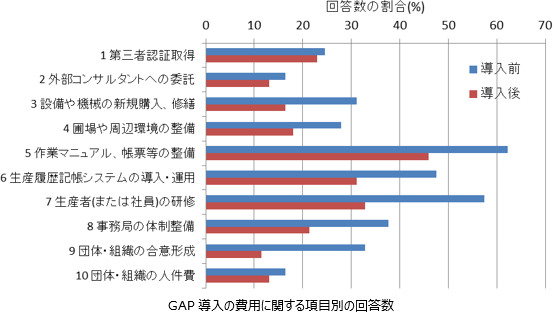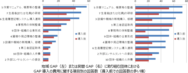 団体で取り組むGAPの類型別では、全体的に地域GAPの団体の方が、民間GAPの団体よりも費用や手間についての回答数が少ない。また、地域GAPの団体については「作業マニュアル・帳票等の整備」、「生産者(または社員)の研修」、「生産履歴記帳システムの導入・運用」の回答が多く、それ以外の項目の回答数は少ない。一方、民間GAPの団体については導入前のいずれの項目も回答数が多いが、「設備や機械の新規購入、修繕」と「第三者認証取得」の回答数が多いことが特徴的である。導入後は「第三者認証取得」と「作業マニュアル・帳票等の整備」の回答数が多く、それ以外の項目の回答数は導入前に比べて少なくなっている。