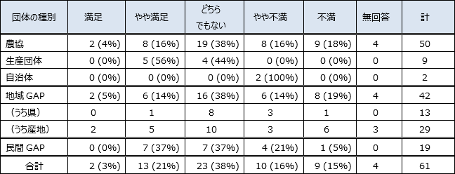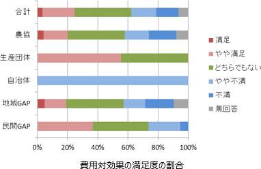 本稿でのアンケート調査対象はGAPの取り組みにおける事務局である。対象とした団体においてはGAPの事務局を農協が担うケースが多かったが、費用対効果の満足度については、農協の場合は生産団体に比べて不満が高い傾向にある。これは、事務局として農協職員の業務量が大幅に増加するが、それに応じたメリットが少ないと感じているためと考えられる。