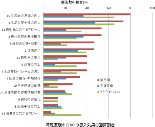 これについては、満足側において、導入効果として「生産者の意識の向上」、「取引先に対するアピール」、「経営の改善・効率化」、「品質の向上」、「食品の安全性の向上」、「食品事故・クレームの減少」、「生産原価の削減」を挙げている割合が高いことを踏まると、GAPの導入にあたって、これらの効果を確実に上げるられるよう、行政等において研修・教育、情報提供等の支援を行っていくことが重要と考えられる。