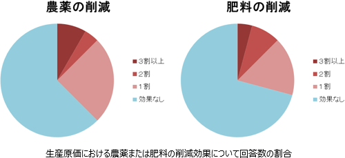 GAP導入による生産原価の削減、特に資材削減の効果について、回答が得られた団体においては、農薬、肥料、その他の資材ともに、過半数が「効果なし」という回答であるが、農薬では約4割、肥料では約3割、生産原価削減の効果が見られた(1割以上)との回答があった。また、3割以上の削減効果を認めた回答もある。