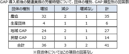 GAP導入による労働時間への影響についての回答数は、増加36、減少3、増減なし2(合計41)である。回答のあった団体の大半で、GAP導入後に事務局と生産者ともに記帳や書類整備などのGAP関連業務の労働時間が増加しており、労働時間が減少または増減なしという団体はごく少数である。特に農協については、労働時間が増加したという回答が35団体中32と大多数を占めている。