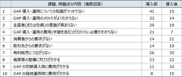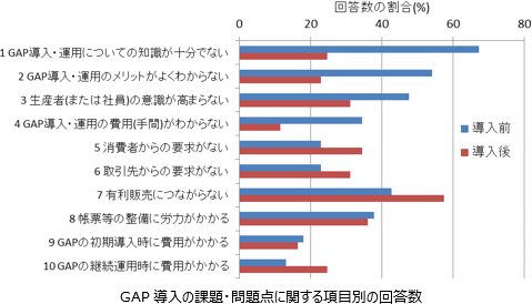 導入前は、「GAP導入・運用についての知識が十分でない」、「GAP導入・運用のメリットがよくわからない」、「生産者(または社員)の意識が高まらない」という回答が多い。なお、「GAPの初期導入時に費用がかかる」との回答は少なかった。