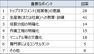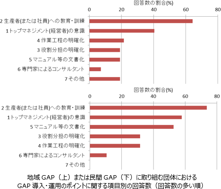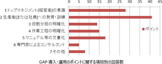 回答数が多かった項目は、「生産者(または社員)への教育・訓練」、次いで「トップマネジメント(経営者)の意識」である。このことから、生産者や社員への教育・指導がなされることによって、取り組みへの理解や意識が高まると考えられる。また、それに先だって経営者や農協幹部などの団体の責任者がGAPに取り組むことを決断することで、GAPに関する業務が明確に位置付けられるといえる。